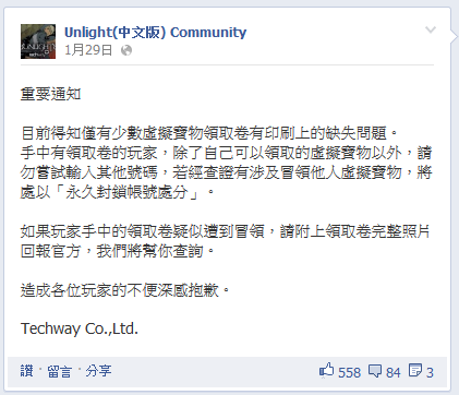 於是官方趕緊在FB發布請大家不要輸入別人的序號,違者永久停權